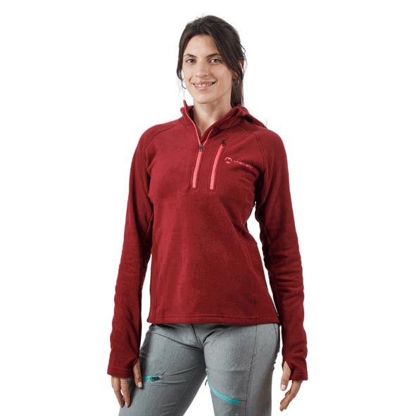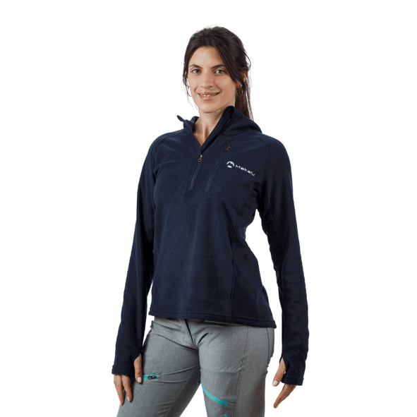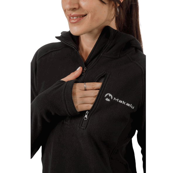 Corte anatómico entallado - Articulación en axilas - Agujero para los pulgares - Amplio bolsillo en el pecho - Capucha integrada - Tapa cierre con cubre pera - Confeccionado en micropolar de 150grs/m2.