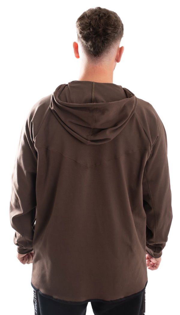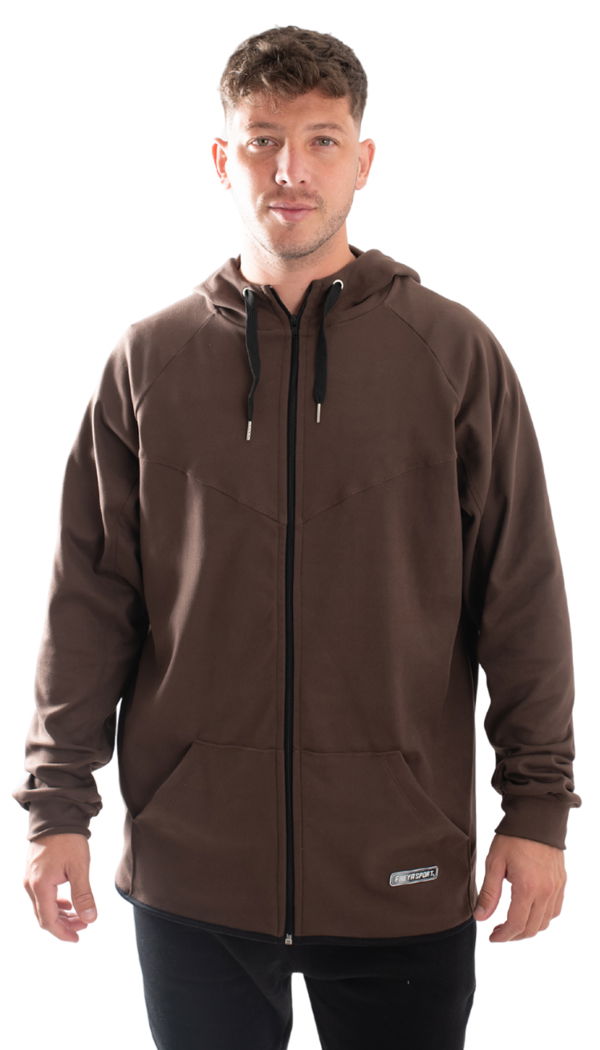 Campera con calce regular y detalles que marcan la diferencia: recortes que estilizan, práctico bolsillo canguro y capucha con cordón ajustable para mayor abrigo.