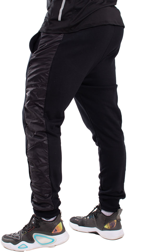 Pantalón babucha confeccionado con rústico de algodón y diseñado con recortes laterales en nylon negro print Oporto. Cintura con elástico y cordón regulable, bolsillos delanteros y bolsillo plaqué en su parte trasera. Posee un detalle de falsa cartera en el frente y puños de ribb, complemento para mejor ajuste.