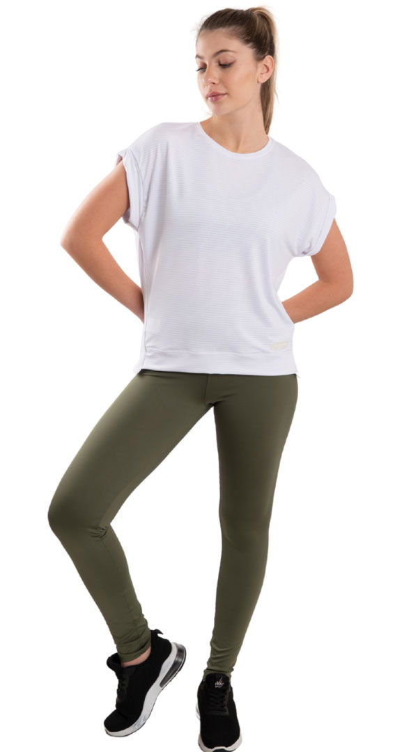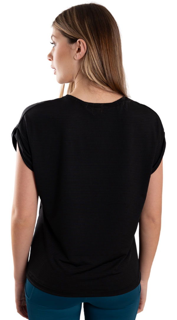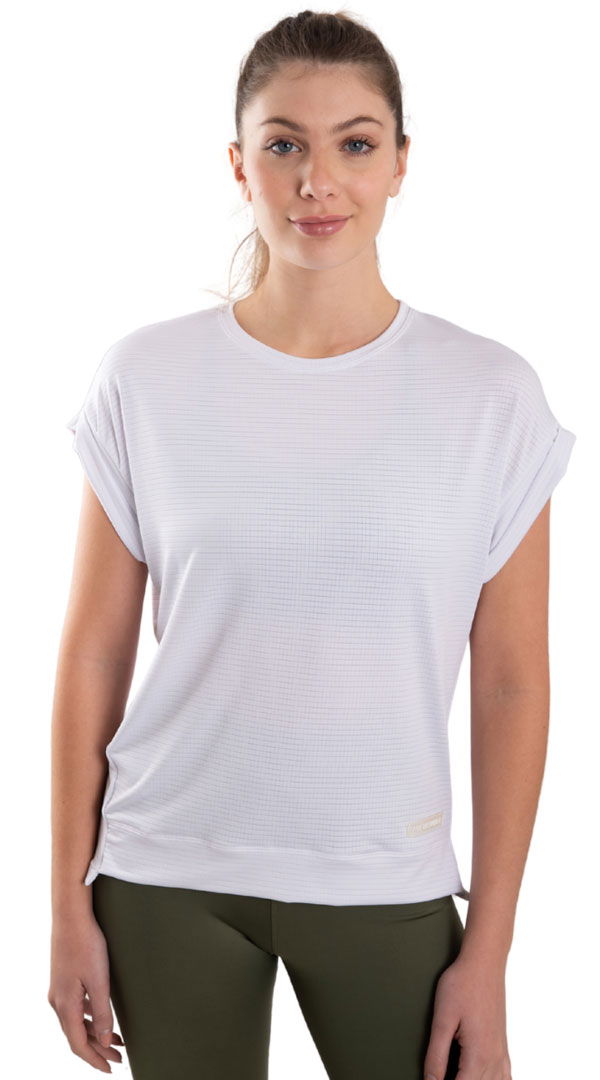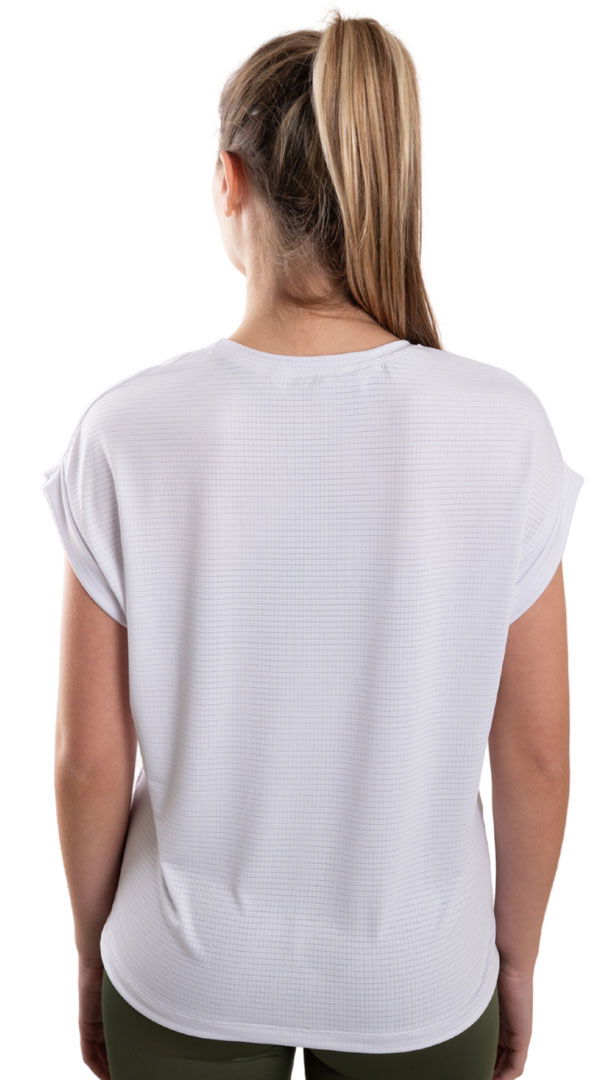Remera confeccionada en un textil súper liviano y elastizado con textura de mini cuadros, que aporta alta respirabilidad y ayuda a regular la temperatura. Sus mangas caídas le dan un aire casual y moderno, mientras que el diseño más largo en la parte trasera suma movimiento y originalidad.