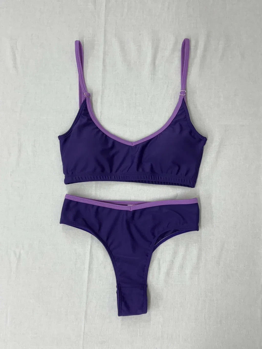 Bikini corpiño Top con corte V al medio, vivo bicolor, colaless tiro alto no regulable.